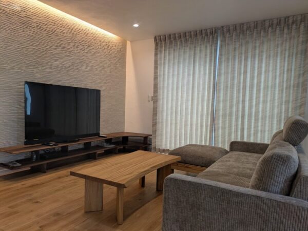 TVの後ろになるアクセント壁は、火山灰シラスの壁、『薩摩中霧島』