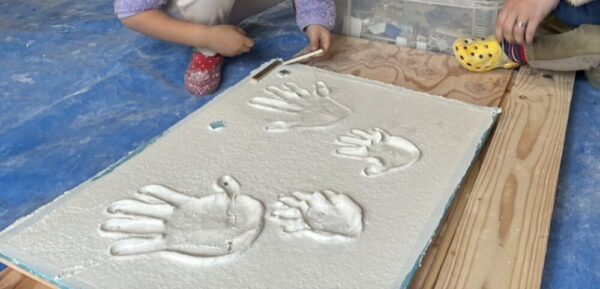最後に、記念にコルクボードにしっくいの手形を残してもらいました。