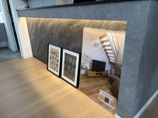 まず目に飛び込んでくるのは、キッチン腰壁にあしらわれたユーロスタッコのアクセント壁