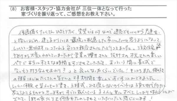 Q.家づくりを振り返って、ご感想をお教えください。